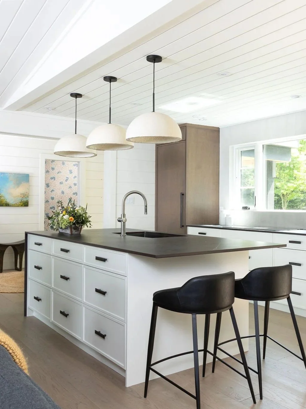 Interior design firm ACM Designs, envisioned the kitchen space to beautifully balance modern sophistication with organic warmth, weaving together natural elements and handcrafted artistry. Hovering over the kitchen island are three Hemi Pendants in Large, adding a soft golden glow to the room while illuminating an important task space.